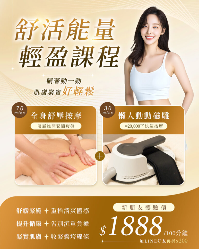100分鐘 舒活能量輕盈課程 結合「全身舒壓按摩」+「專利磁雕按摩」,新朋友體驗價$1888,加LINE好友再享折價$200 ,馬上加LINE預約 ➡︎ https://lin.ee/DWAZAlk